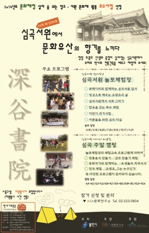 - 놀토체험장, 주말캠핑 등 다양한 체험·놀이 통한 문화재 활용 용인시는 오는 4월 4일부터 ‘문화유산의 향기를 느끼다’란 주제로 다양한 학생 체험프로그램을 시작한다. 이번 체험 프로그램은 ‘2014년 문화재청 살아 숨 쉬는 향교·서원 문화재 활용 우수사업’으로 선정되었으며, 작년에 이어 올해에는 당일 프로그램인 ‘심곡서원 놀토체험…