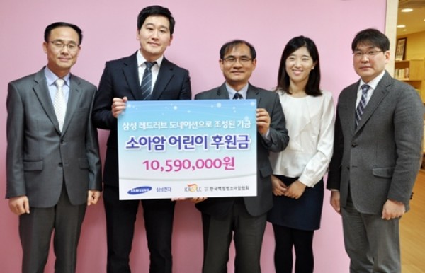 삼성전자가 3월18일(수) 서울 마포구에 위치한 (사)한국백혈병 소아암협회(회장 이중명, 이하 소아암협회)를 방문해 임직원 헌혈을통해 조성된 1,059만원의 후원금을 전달했다. 이 후원금은 삼성나노시티(삼성전자 반도체사업장)에서 실시한 헌혈캠페인의 일환으로 헌혈에 참가한 임직원 1명당 회사가 1만원을적립해 소아암 아동의 치료비로 후원하는 『레드 러브…