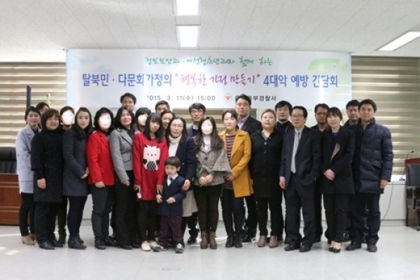 용인동부경찰서(서장 정승호)는, 2015. 3. 11(수) 경찰서 2층 소회의실에서 4대 사회악 피해로 인한 북한이탈주민·다문화가정 등 사회적 약자의 국내 정착 애로를 극복하기 위하여 탈북민 신변보호를 담당하는 정보보안과와 여성·청소년 범죄 수사를 담당하는 여성청소년과와 협업하여 예방우선 간담회를 개최하였다. 이날 간담회에 참석한 북한이탈주민과 결혼이주여…