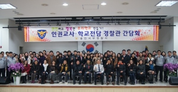용인서부경찰서(서장 이 석)은, 지난 10일 경찰서 2층 강당에서 용인 수지구․기흥구 학교 인권부장 교사 75명을 초청, 학교폭력 없는 안전하고 행복한 학교를 만들기 위해 경찰․인권부장 간의 간담회를 가졌다. 이날 간담회에는 경찰관계자 및 인권부장 교사 등 85명이참석한 가운데 행사에 앞서 학교전담경찰관과 인권부장이 함께 학교폭력 유…