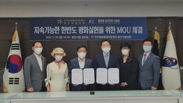 민주평화통일자문회의 용인시협의회가 통일을 실천하는 사람들(이하 ‘통일천사’)와 한반도 평화 실천을 위한 업무협약(MOU)을 체결했다고 22일 밝혔다. 용인시청 접견실에서 진행된 협약식에는 석종섭 협의회장을 비롯해 민주평통 자문위원과 통일천사 관계자 등 12명이 참석했다. 협약에 따라 두 기관은 지속 가능한 한반도 평화 실현을 위해 앞으로 통일 기반 조성에 관한 공감대 확산 사업 등 통일운…