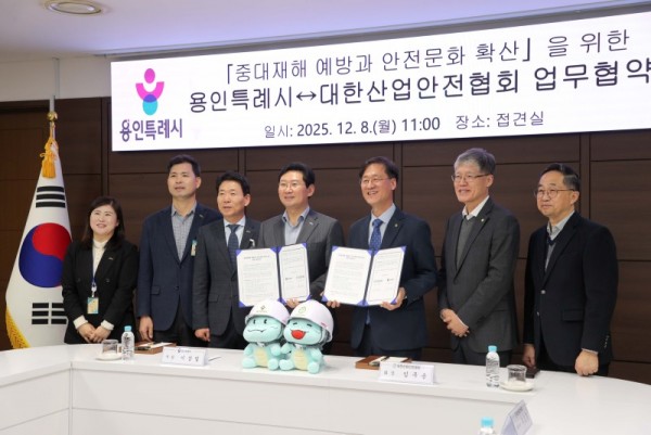 용인특례시(시장 이상일)는 8일 시청 4층 접견실에서 대한산업안전협회와 ‘중대재해 예방과 안전문화 확산을 위한 업무협약’을 맺었다. 이날 협약식에는 이상일 시장과 임무송 대한산업안전협회 회장, 주도종 기술이사, 강원석 경기지역본부장이 참석했다. 시와 협회는 ▲중대재해 예방을 위한 자문 ▲용인시 종사자 대상 안전교육과 재해예방 역량 강화 지원 ▲시민 안전을 위한 안전점검 지원 ▲건설안전과 시설 안전에 관한 자문 ▲안전문화 확산을 위한 공동 캠페인 등을 추진하기로 했다. 시는 협약을 계기로 고도화된…