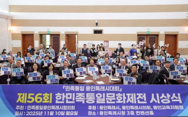 용인특례시(시장 이상일)는 10일 시청 컨벤션홀에서 민족통일 용인특례시협의회주관으로 ‘민족통일 용인특례시대회와 제56회 한민족통일문화제전 시상식’이 열렸다고 밝혔다. 이날 행사는 한반도의 평화와 통일을 주제로 한 글짓기·웹툰·포스터·사진 공모전의 입상작을 시상하고, 유공회원에게 표창을 수여하고자 마련됐다. 민족통일 용인특례시협의회는 1981년 창립한 단체로 매년 태극기 나눔을 비롯해 지역사회 통일운동 의식 제고 등을 위한 다양한 활동을 벌이고 있다. 이날 협의회는 홍보자료 시청, 통일 관련 동영…